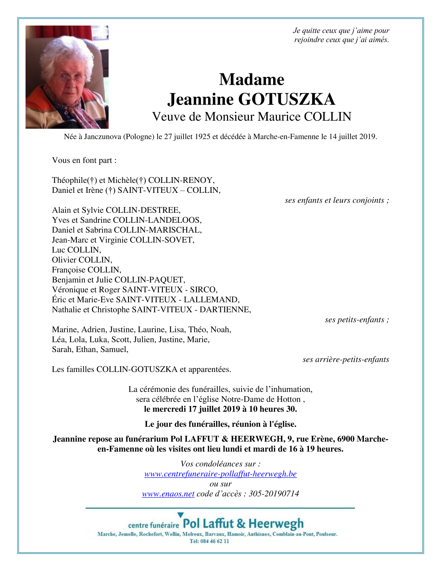 Fallecida en Marche-en-Famenne (6900, Bélgica) el domingo, 14 de julio de 2019 a la edad de 93 años