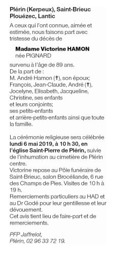 Died in Plérin (22190) on 01 May 2019 at the age of 89 years