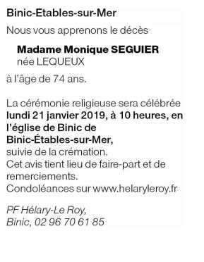 Décédée à Binic (22520) le vendredi 18 janvier 2019 à l'âge de 74 ans
