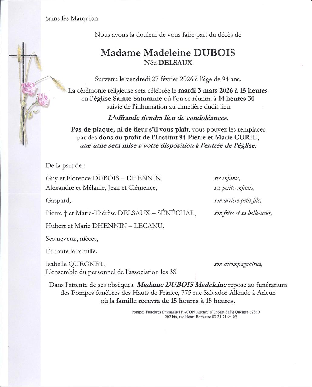 Madame Madeleine DUBOIS née DELSAUX