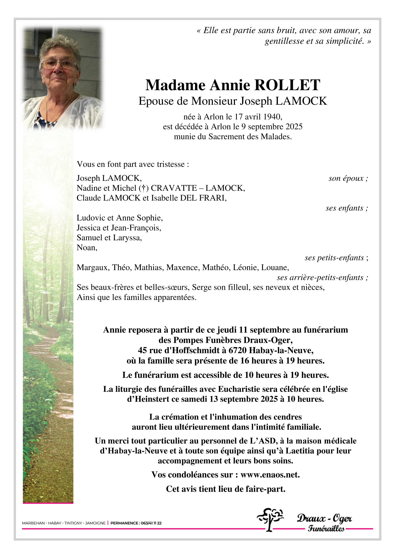 Fallecida en Arlon (6700, Bélgica) el martes, 9 de septiembre de 2025 a la edad de 85 años