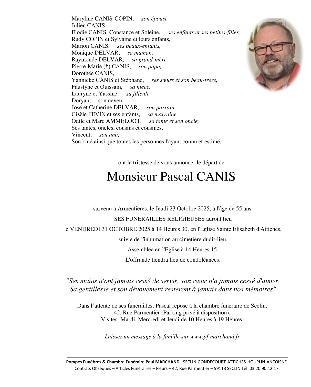Décédé à Armentières (59280) le jeudi 23 octobre 2025 à l'âge de 55 ans