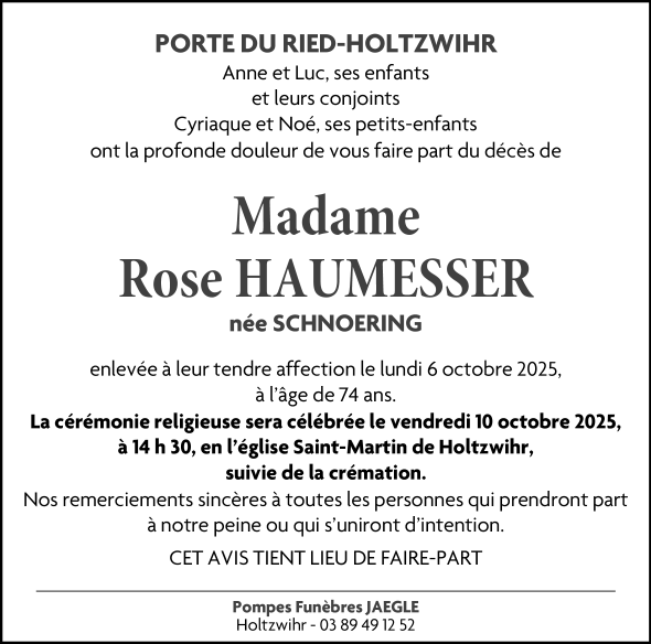 Fallecida en Holtzwihr (68320) el lunes, 6 de octubre de 2025 a la edad de 74 años