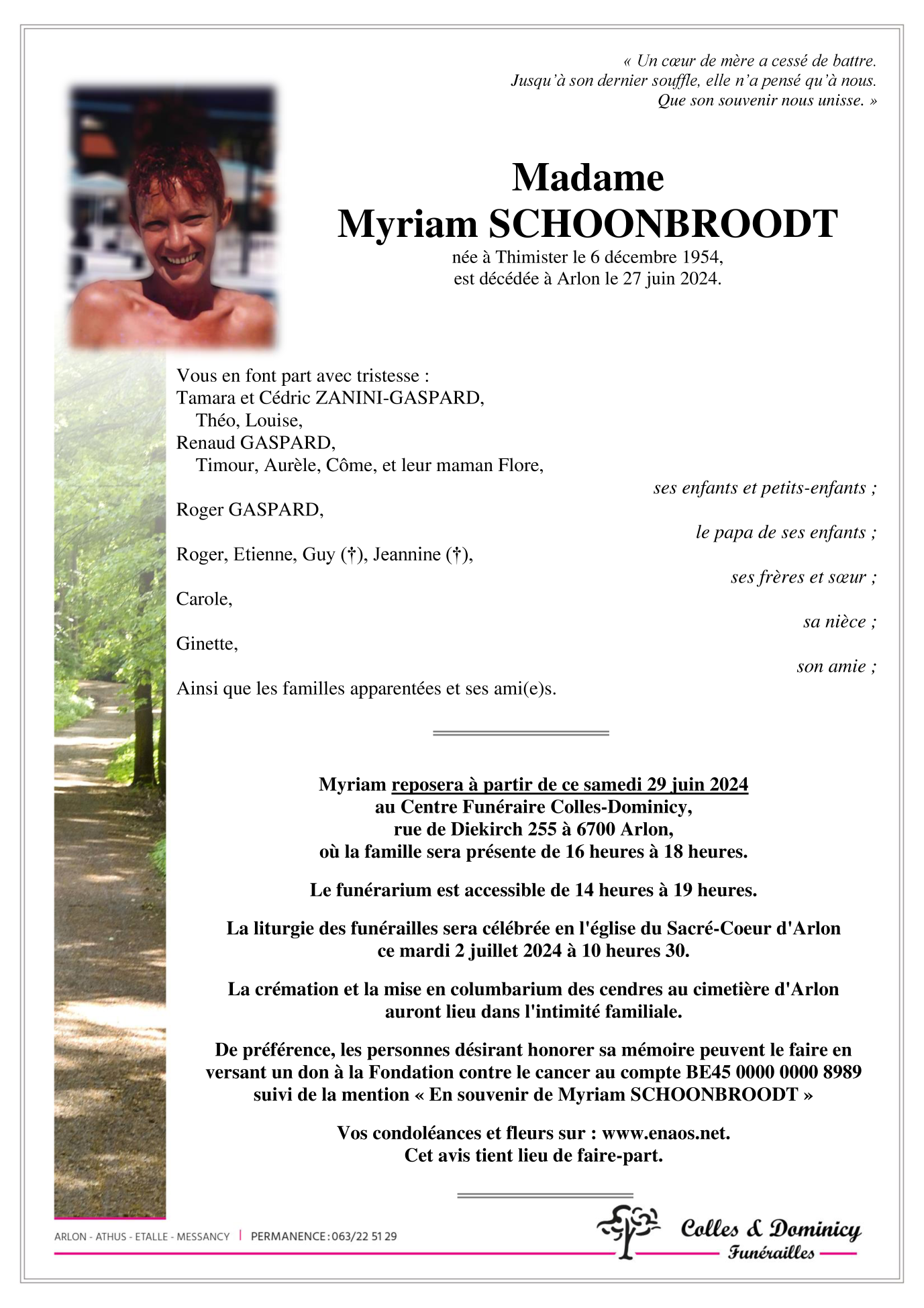 Décédée à Arlon (6700, Belgique) le jeudi 27 juin 2024 à l'âge de 69 ans