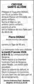 Décédé à Bergerac (24100) le lundi 19 janvier 2026 à l'âge de 96 ans