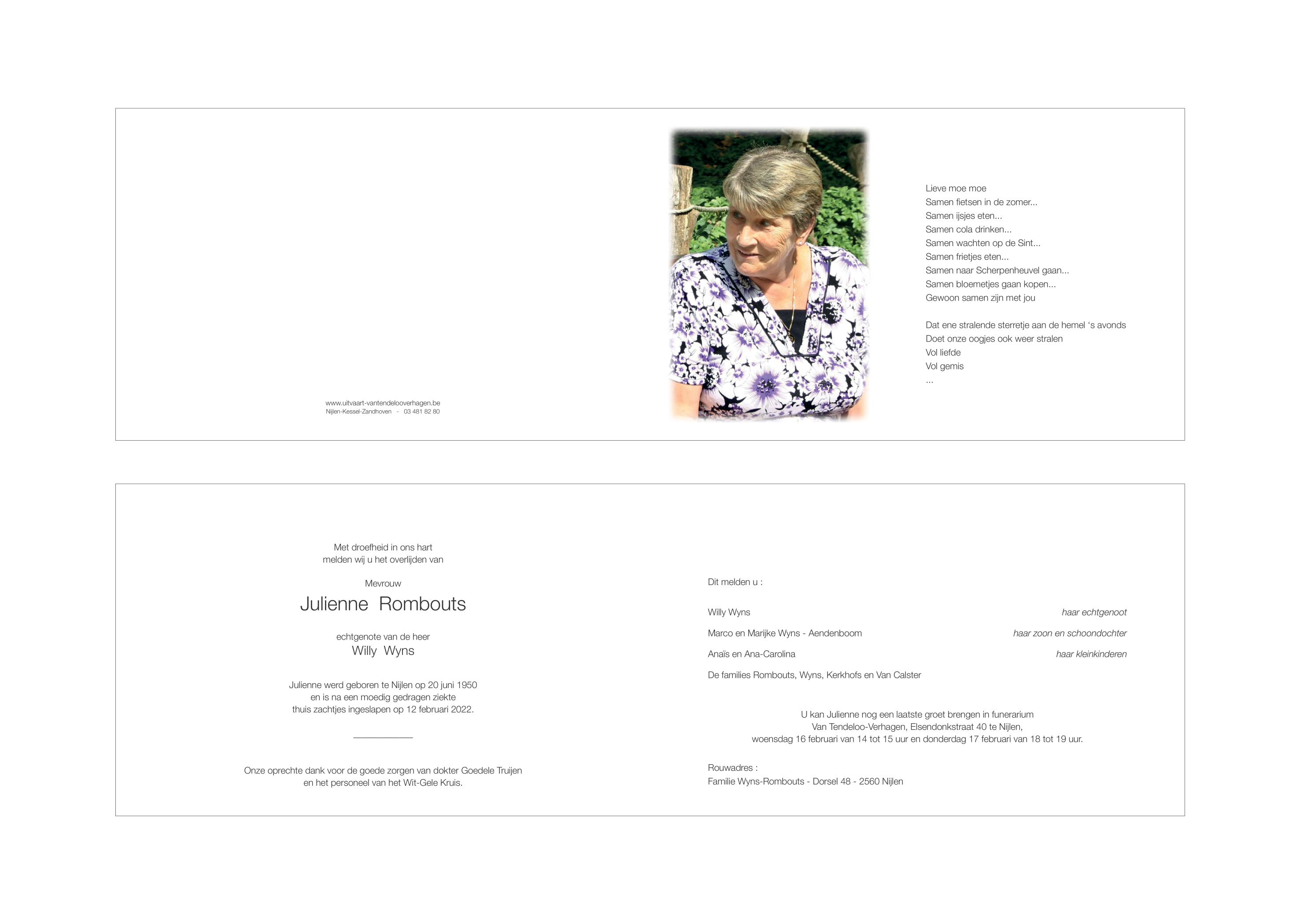Fallecida en Nijlen (2560, Bélgica) el sábado, 12 de febrero de 2022 a la edad de 71 años
