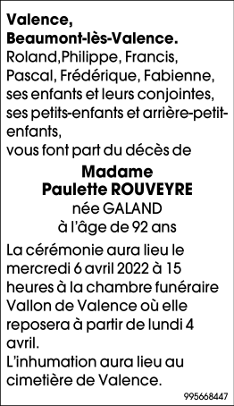 Overleden te Valence (26000) op zaterdag 2 april 2022 op 92-jarige leeftijd