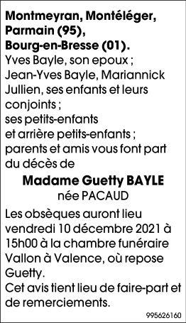 Décédée à Montmeyran (26120) le lundi 6 décembre 2021 à l'âge de 84 ans
