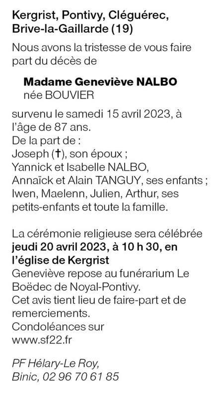 Overleden te Pontivy (56300) op zaterdag 15 april 2023 op 87-jarige leeftijd