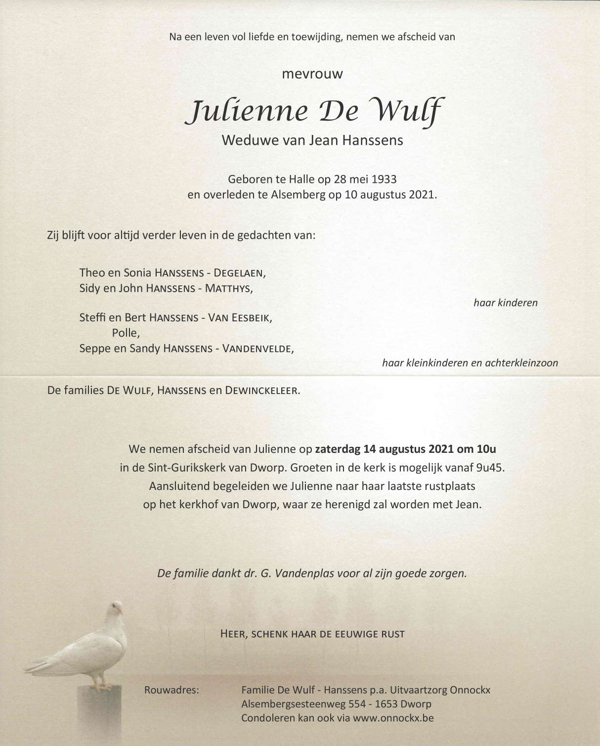 Décédée à Alsemberg (1652, Belgique) le mardi 10 août 2021 à l'âge de 88 ans
