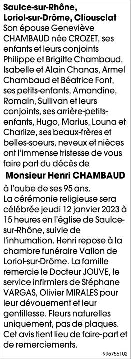 Décédé à Crest (26400) le lundi 9 janvier 2023 à l'âge de 94 ans