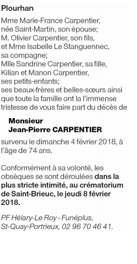 Décédé à Plourhan (22410) le dimanche 4 février 2018 à l'âge de 74 ans