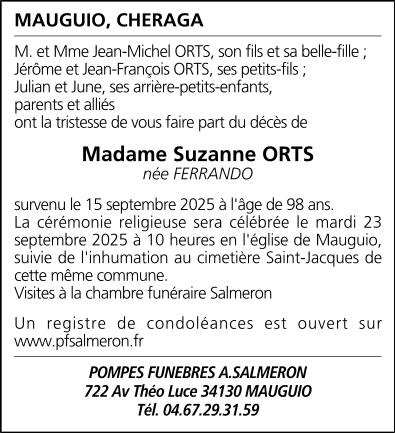 Décédée à Mauguio (34130) le lundi 15 septembre 2025 à l'âge de 98 ans