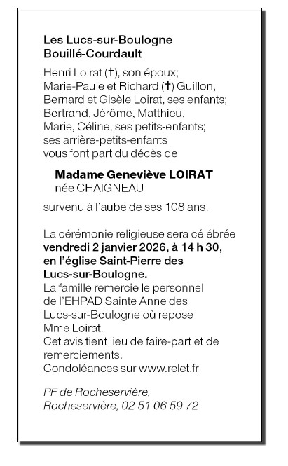 Décédée à Les Lucs-sur-Boulogne (85170) le lundi 29 décembre 2025 à l'âge de 107 ans