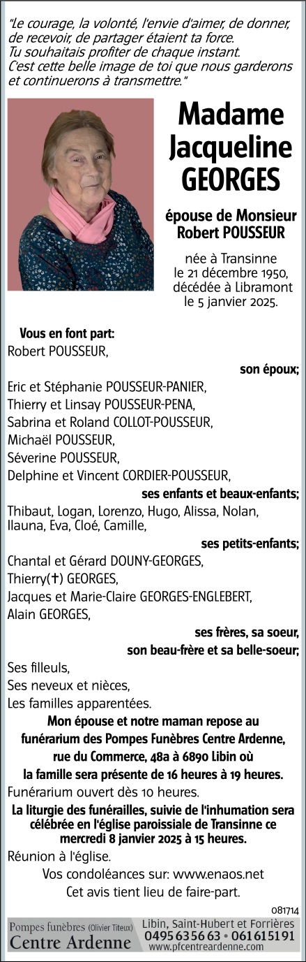 Overleden te Libramont-Chevigny (6800, België) op zondag 5 januari 2025 op 74-jarige leeftijd
