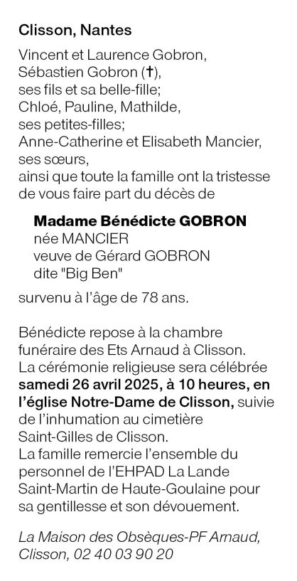 Décédée à Haute-Goulaine (44115) le mercredi 16 avril 2025 à l'âge de 78 ans