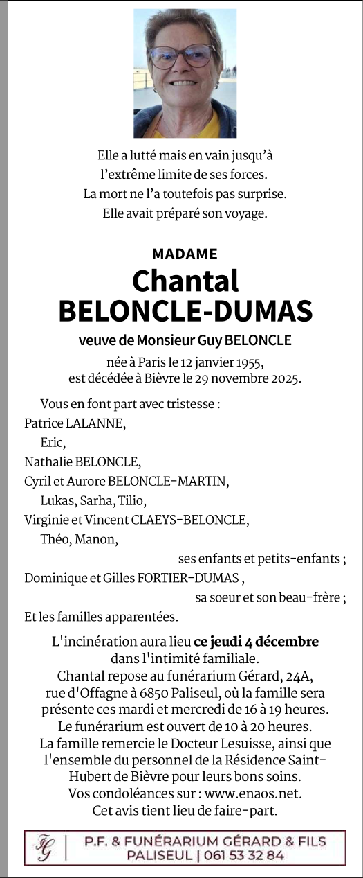 Décédée à Bievre (5555, Belgique) le lundi 1 décembre 2025 à l'âge de 70 ans