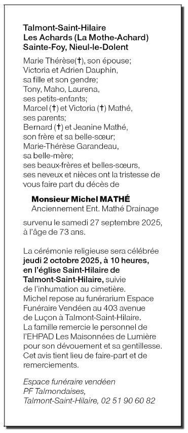 Fallecido en Les Sables d'Olonne (85100) el sábado, 27 de septiembre de 2025 a la edad de 73 años