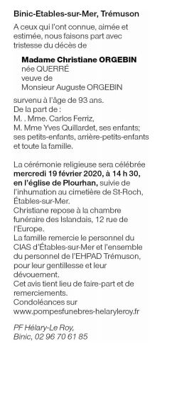 Décédée à « Localité inconnue » le jeudi 13 février 2020 à l'âge de 93 ans