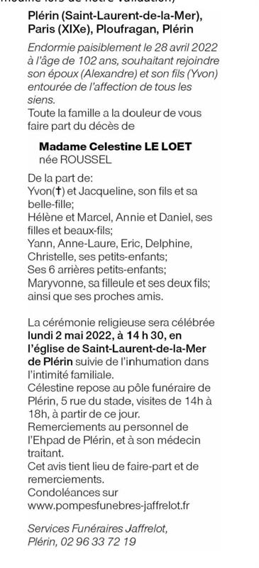Fallecida en Plérin (22190) el jueves, 28 de abril de 2022 a la edad de 102 años
