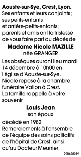 Décédée à Crest (26400) le jeudi 9 décembre 2021 à l'âge de 83 ans