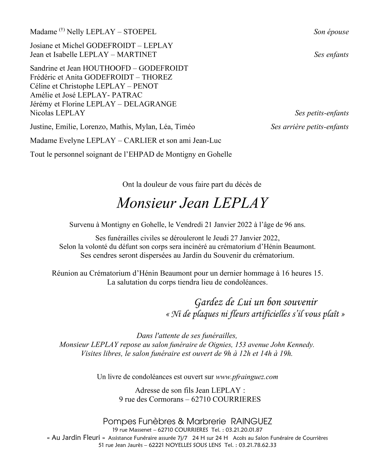 Décédé à Montigny-en-Gohelle (62640) le vendredi 21 janvier 2022 à l'âge de 96 ans