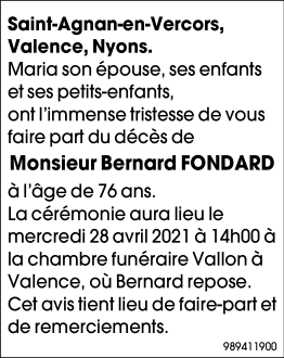 Décédé à Romans-sur-Isère (26100) le vendredi 23 avril 2021 à l'âge de 76 ans