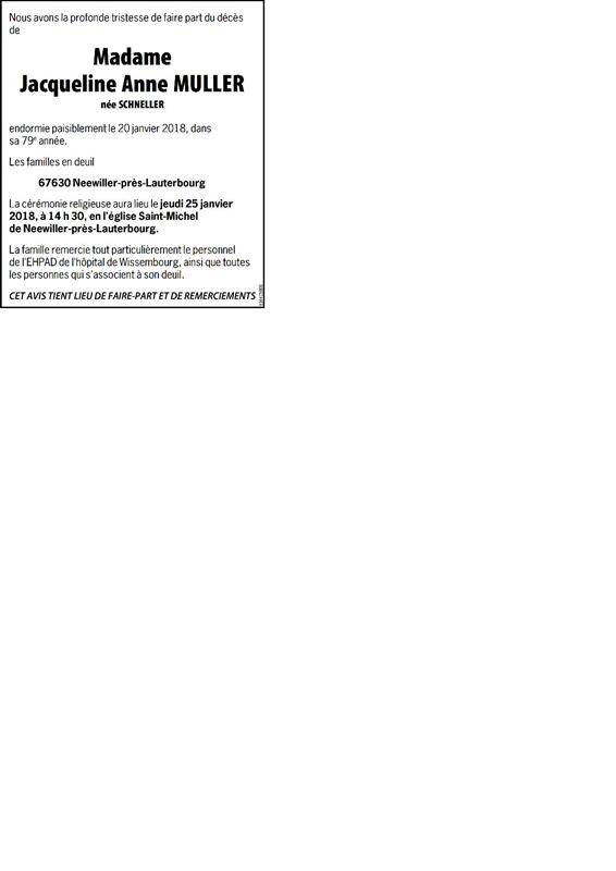Décédée à Wissembourg (67160) le samedi 20 janvier 2018 à l'âge de 78 ans