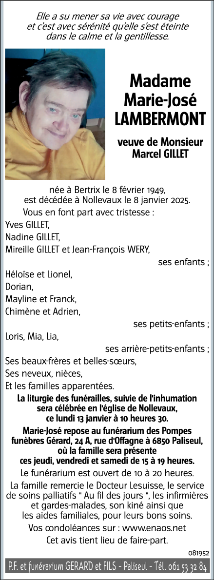 Died in Nollevaux (6851, Belgium) on 08 January 2025 at the age of 75 years