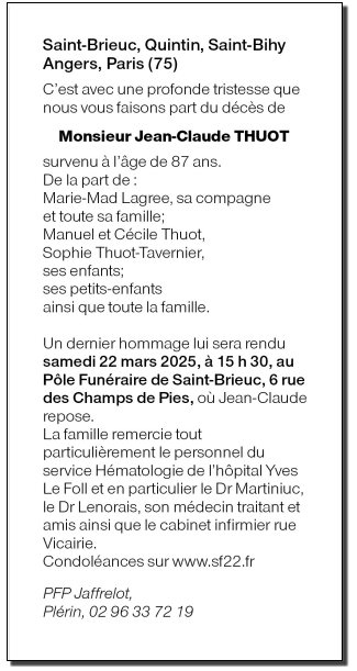 Décédé à Saint-Brieuc (22000) le lundi 17 mars 2025 à l'âge de 87 ans
