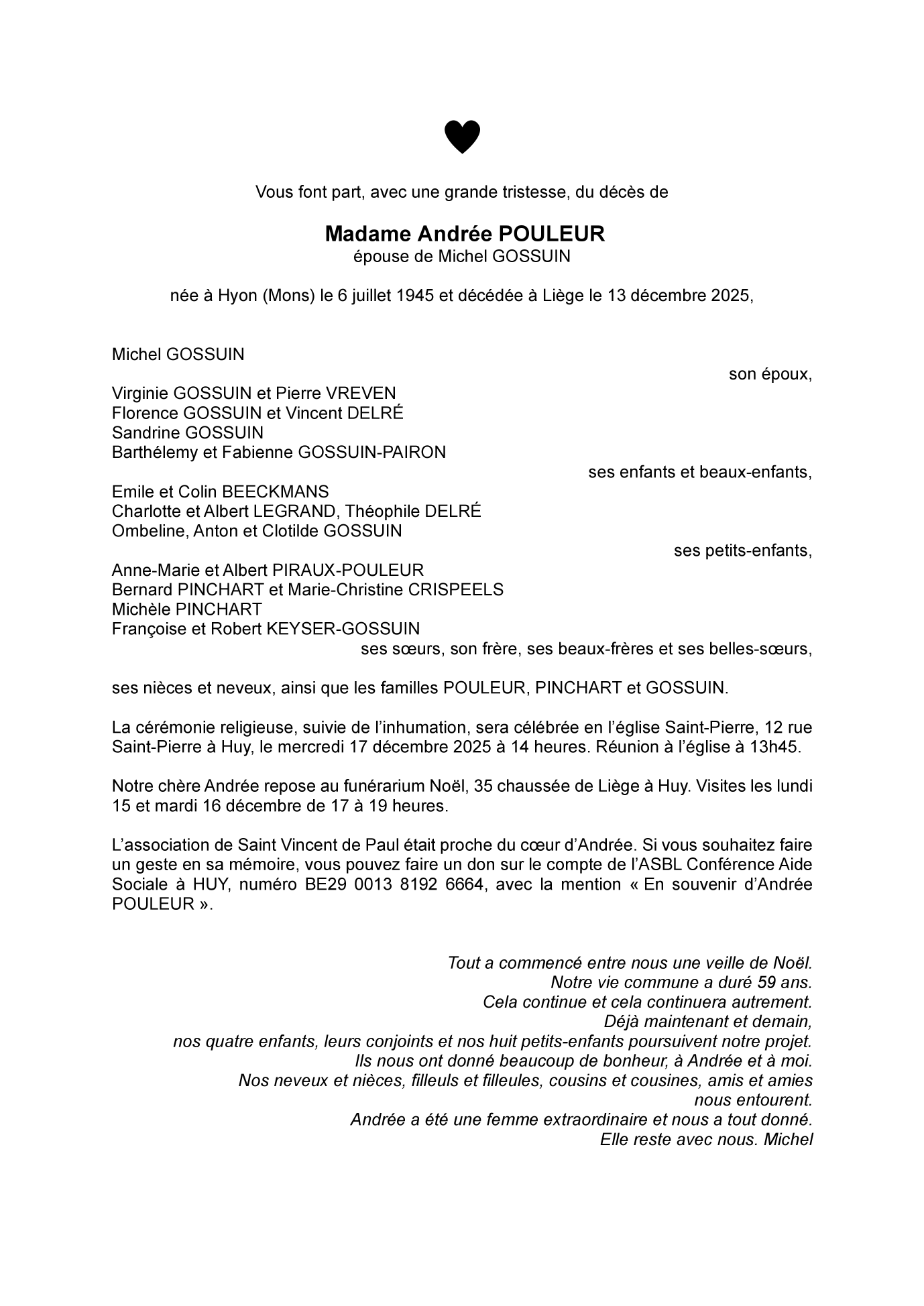 Décédée à Liège (4000, Belgique) le samedi 13 décembre 2025 à l'âge de 80 ans