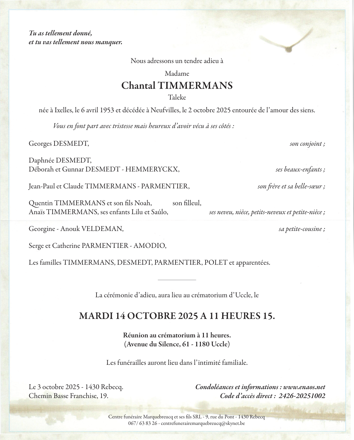 Décédée à Neufvilles (7063, Belgique) le jeudi 2 octobre 2025 à l'âge de 72 ans