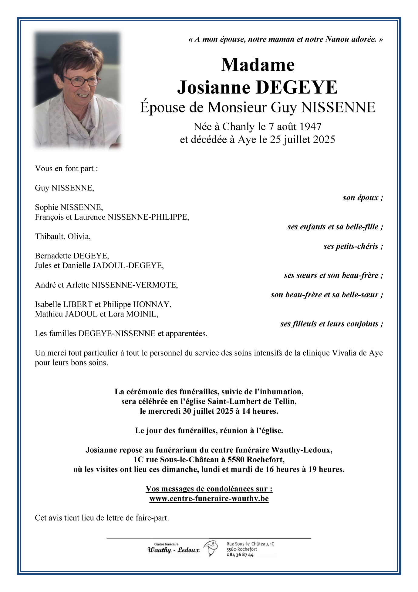 Fallecida en Aye (6900, Bélgica) el viernes, 25 de julio de 2025 a la edad de 77 años