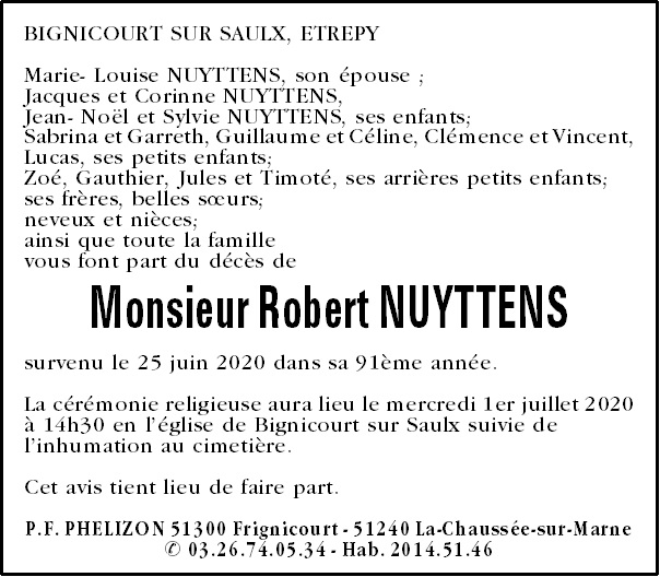 Décédé à Bignicourt-sur-Saulx (51340) le jeudi 25 juin 2020 à l'âge de 90 ans