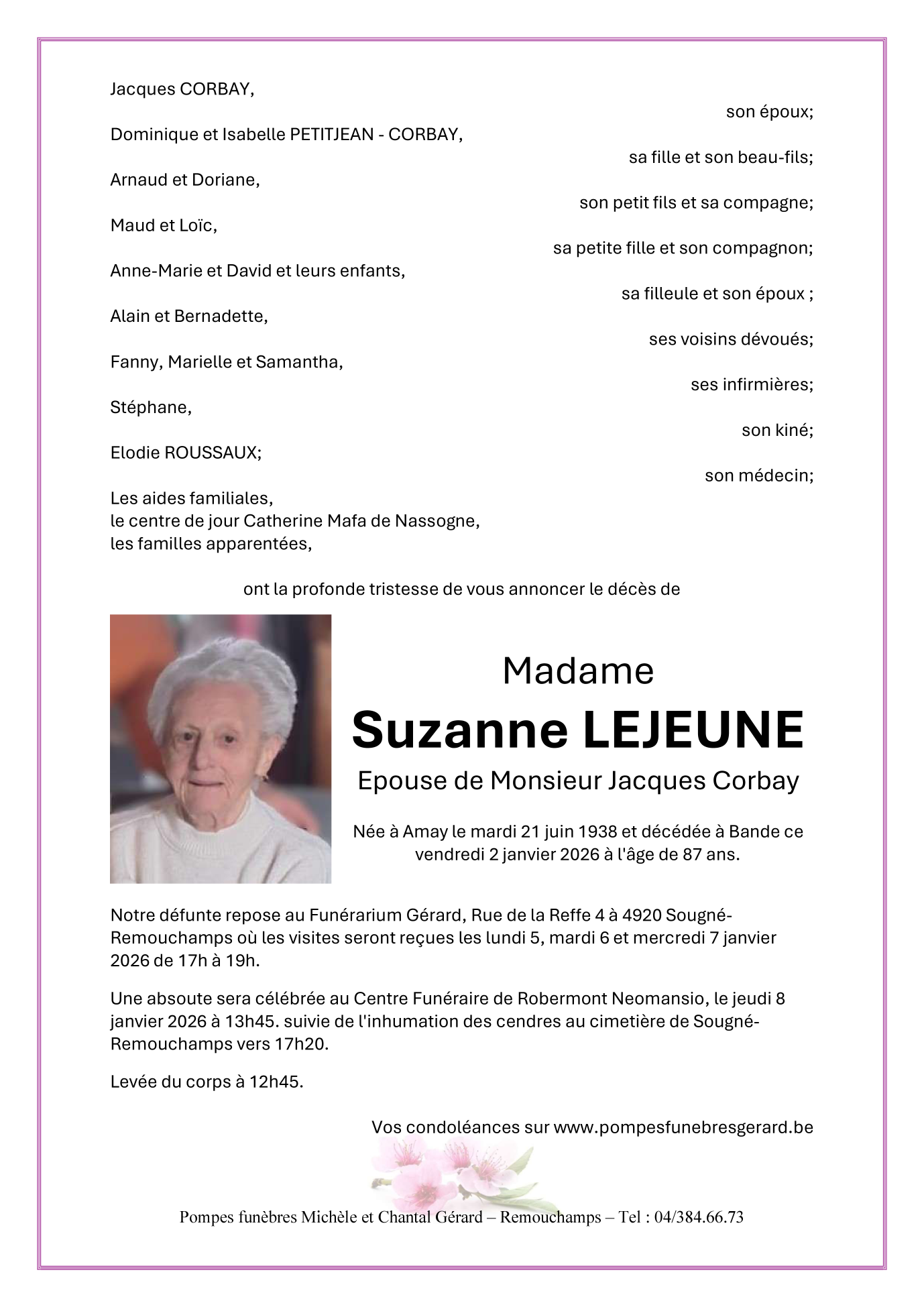Died in Bande (6951, Belgium) on 02 January 2026 at the age of 87 years
