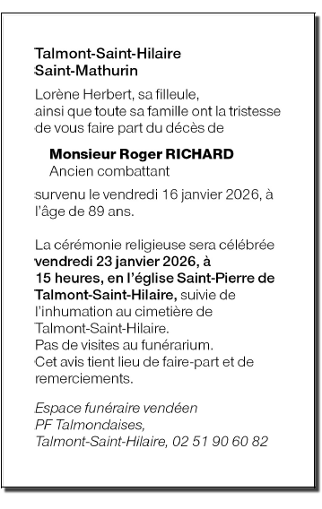 Décédé à Talmont-Saint-Hilaire (85440) le vendredi 16 janvier 2026 à l'âge de 89 ans