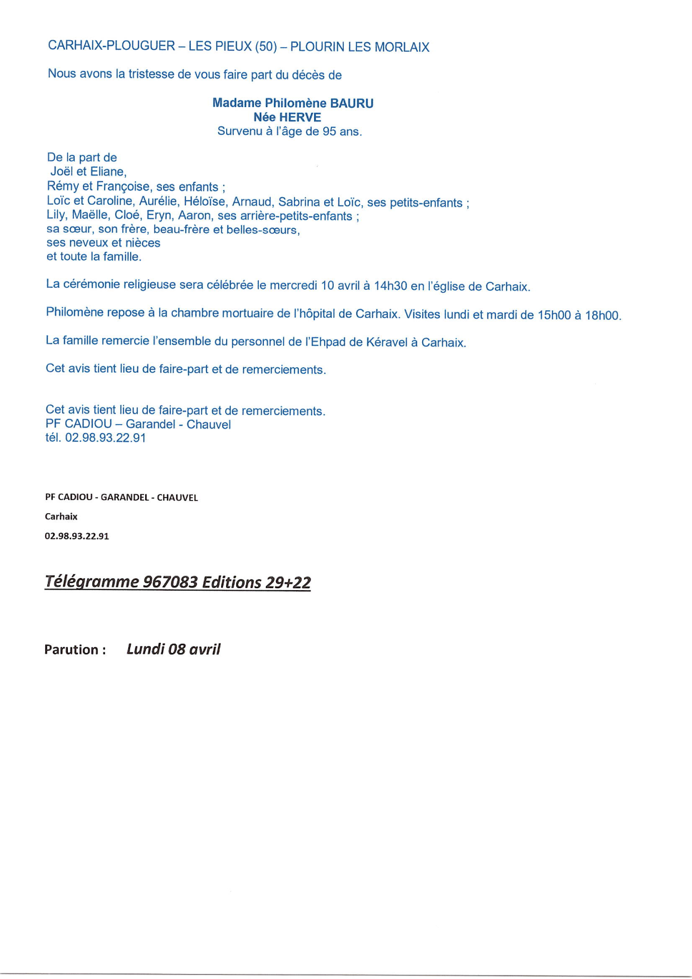 Décédée à Carhaix-Plouguer (29270) le samedi 6 avril 2024 à l'âge de 95 ans