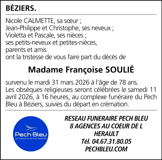 Décédée à Béziers (34500) le mardi 31 mars 2026 à l'âge de 78 ans