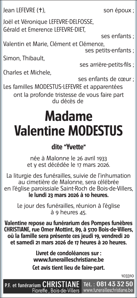 Madame Valentine LEFEVRE née MODESTUS