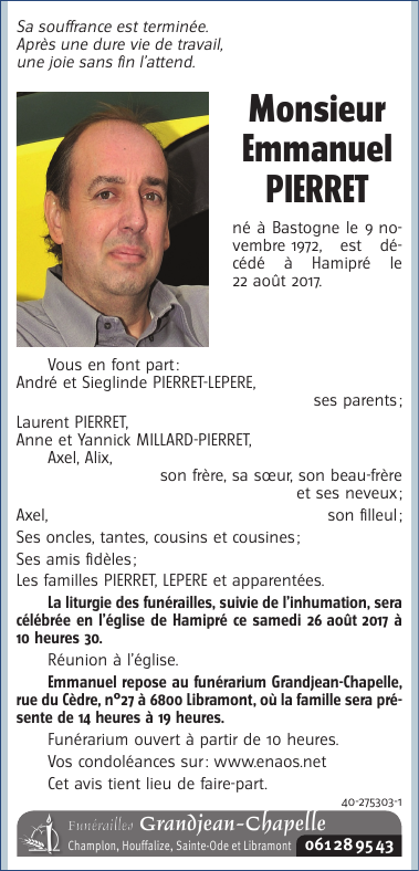 Décédé à Hamipré (6840, Belgique) le mardi 22 août 2017 à l'âge de 44 ans