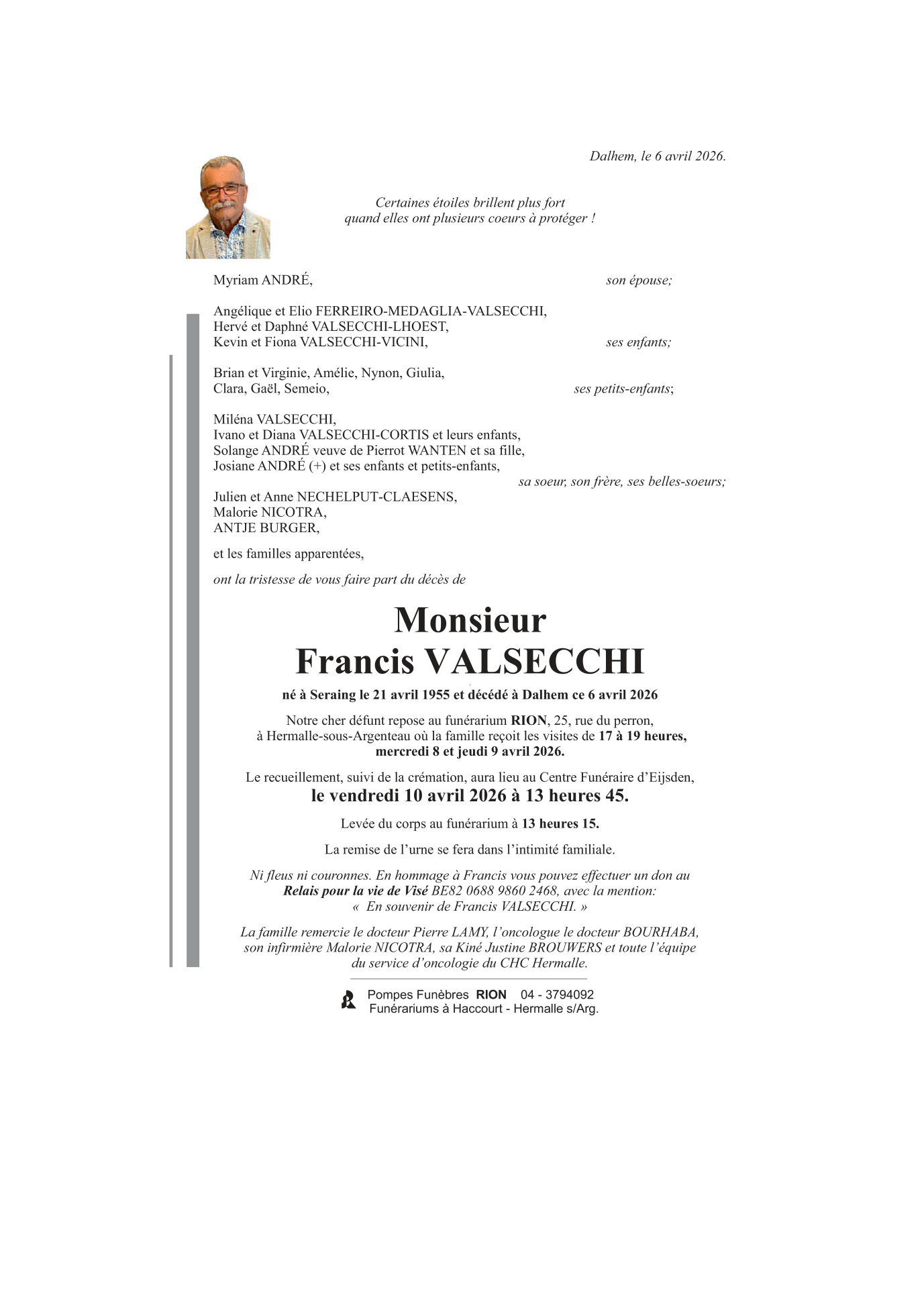 Décédé à Dalhem (4607, Belgique) le lundi 6 avril 2026 à l'âge de 70 ans