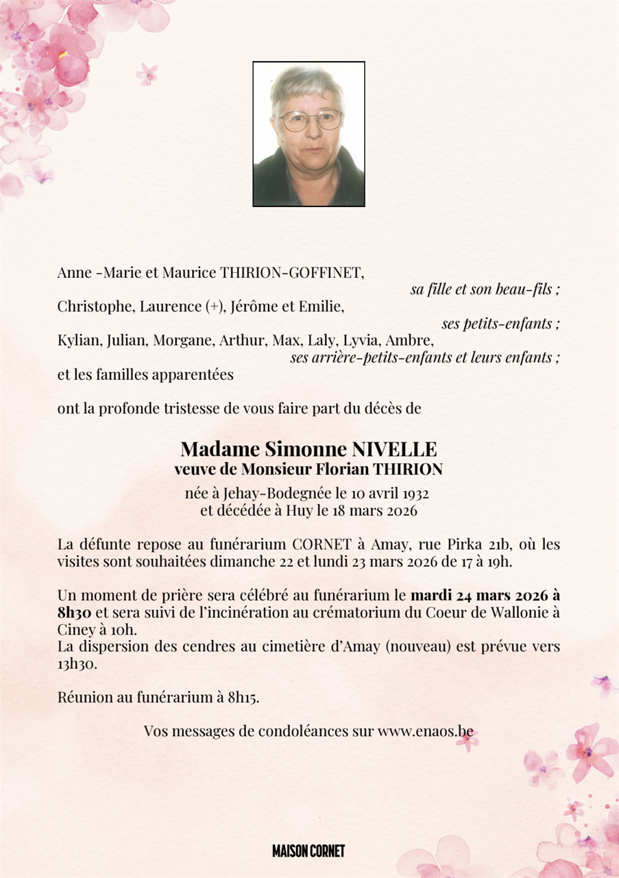 Décédée à Huy (4500, Belgique) le mercredi 18 mars 2026 à l'âge de 93 ans