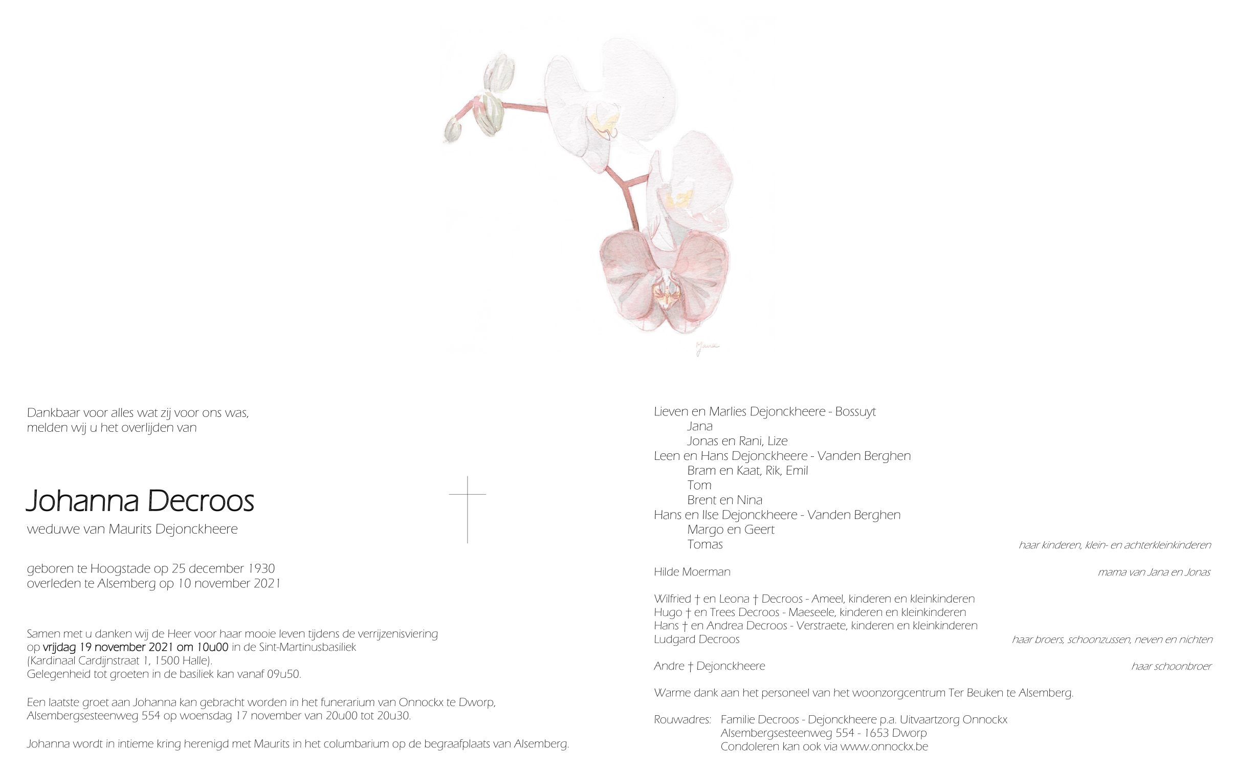 Overleden te Alsemberg (1652, België) op woensdag 10 november 2021 op 90-jarige leeftijd