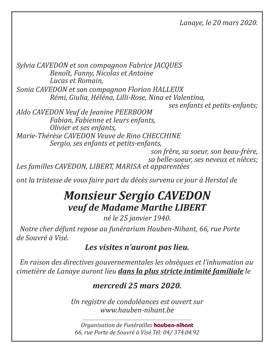 Overleden te Herstal (4040, België) op vrijdag 20 maart 2020 op 80-jarige leeftijd