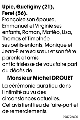 Overleden te Upie (26120) op zondag 26 april 2020 op 73-jarige leeftijd