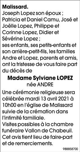 Décédée à Valence (26000) le jeudi 8 avril 2021 à l'âge de 79 ans