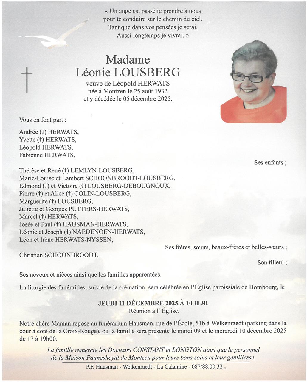 Décédée à Montzen (4850, Belgique) le vendredi 5 décembre 2025 à l'âge de 93 ans