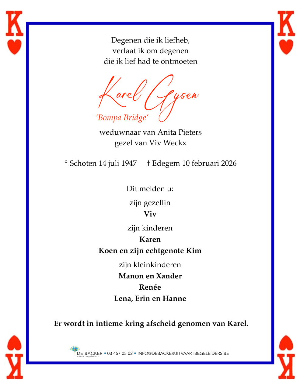 Overleden te Edegem (2650, België) op dinsdag 10 februari 2026 op 78-jarige leeftijd