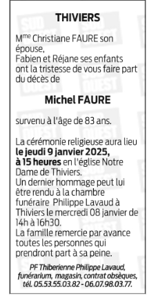 Décédé à Périgueux (24000) le mardi 7 janvier 2025 à l'âge de 83 ans