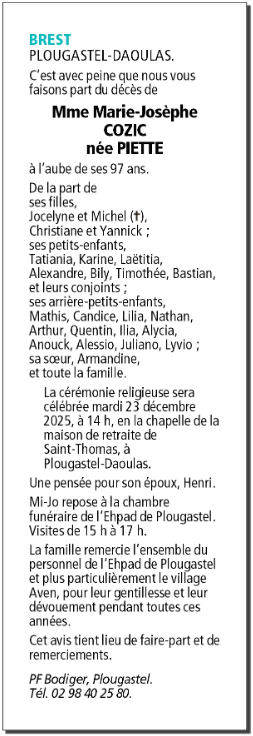 Madame Marie-Josèphe COZIC née PIETTE